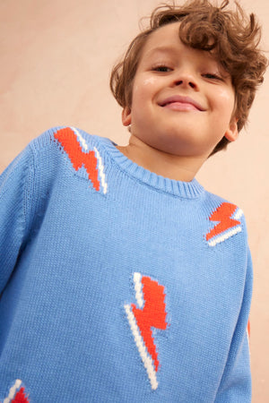 A bolt storm of playful energy. This vibrant jumper features a whirlwind of iconic lightning bolts in classic red and blue, designed for powerful play and everyday adventures.