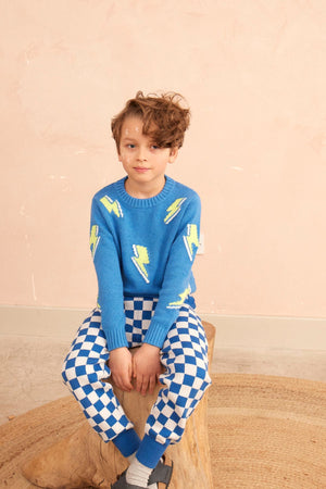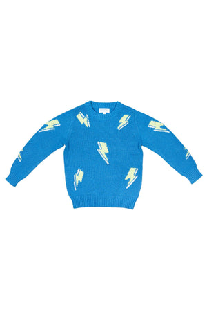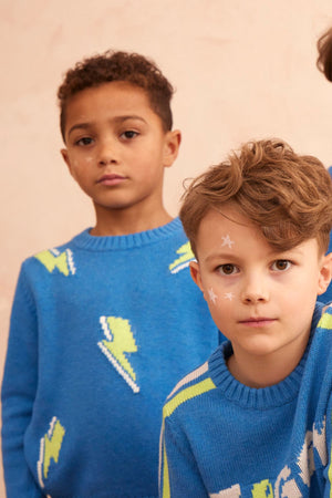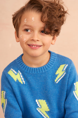 A bolt storm of playful energy. This vibrant jumper features a whirlwind of iconic lightning bolts in classic red and blue, designed for powerful play and everyday adventures.