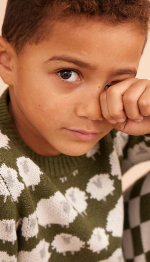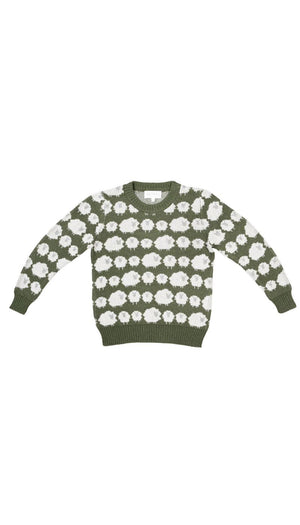 • Gentle Flock of Sheep: Features rows of sweet, classic jacquard-knit sheep inspired by fair isle patterns, creating a timeless and playful design.